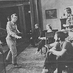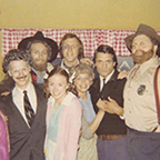In 1977, Terry played the lead horse in the Oregon premiere of "Equus" at Portland State University. The show went on to win the Award of Excellence at the American College Theatre Festival, and the cast was invited to perform their production at the Kennedy Center in Washington, DC. Terry is pictured here with Will Weigler as Alan Strang in the "night ride" scene at the end of Act 1. Wearing steel "hooves" and the sculpture head, Terry and the other horses stood nearly 8 feet tall. |