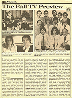 Tele-Visions: The Fall TV PreviewExcerpt: St. Elsewhere is an ensemble drama set in a Boston hospital from Hill Street Blues producers MTM. Of the cast of 12, the most well known are William Daniels (also the voice of car computer KITT in Knight Rider) and David Birney, though Terence Knox is sure to win early attention as the handsome Dr. White. |