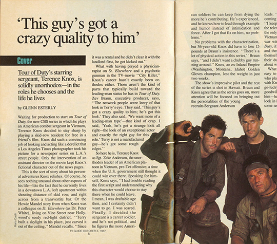 Knox was upset again when he was informed his character was going to be shot and killed. "But that character made a bigger impact than anything I've done," he says now. "People still approach me on the street about it." ("Terry will not die on Tour of Duty," jokes Zev Braun, "unless, of course, he starts making unreasonable contract demands.")