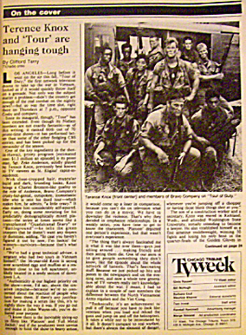 "He has a very practical outlook, kind of homespun, and the kind of wisdom that comes from wanting to keep as many people alive as he can. He's not in Vietnam to make a political statement or anything. He's there because he wants to do it right. He's also there because he'd just be too restless being somewhere else." Knox himself has had no military experience, "When I was in collegeI graduated in '73I didn't have to worry about going because I had bad knees. But when I was in high school, I remember I was scared to death about being sent there. There were tough choices in those days, and I'm not sure what I would have done. One thing I do know. After shooting this show, I've developed a real respect for the military that I didn't have before. I mean, being around that sergeant who's been in the service for something like 20 years and who's still training troopers, and I tell you, I see one happy man."